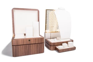 Durante la edición de septiembre, To Be Packing presentó al mercado asiatico vitrinas en algodón y lino. También presentamos expositores y cuellos el alcántara con decoraciones en oro.
